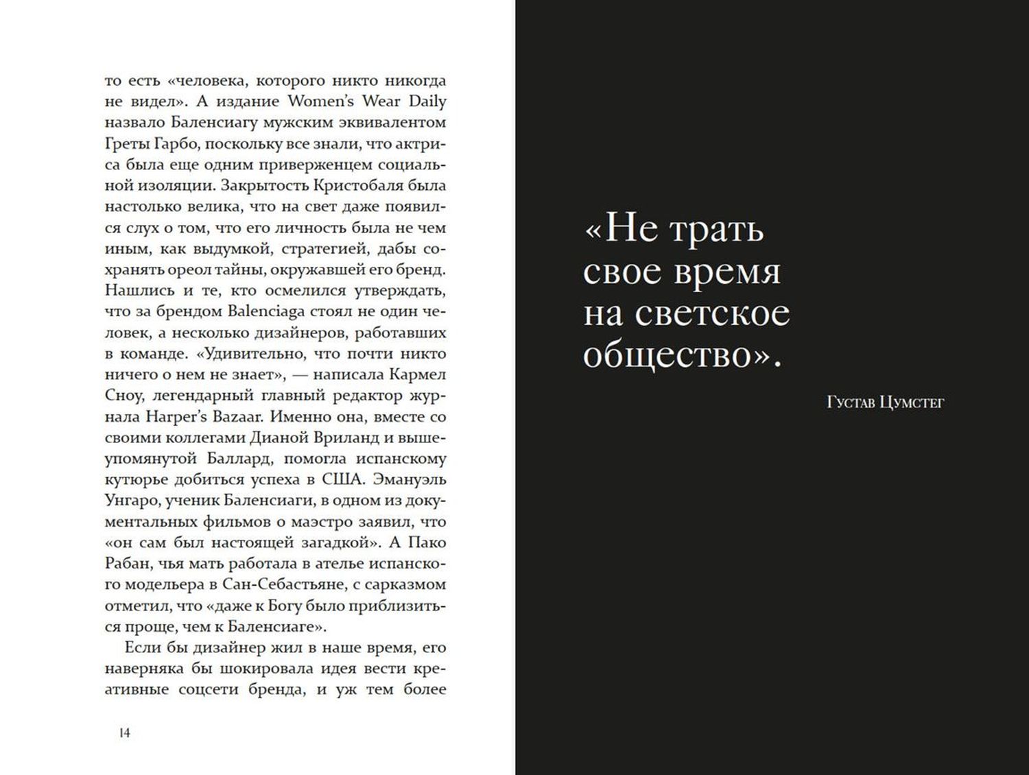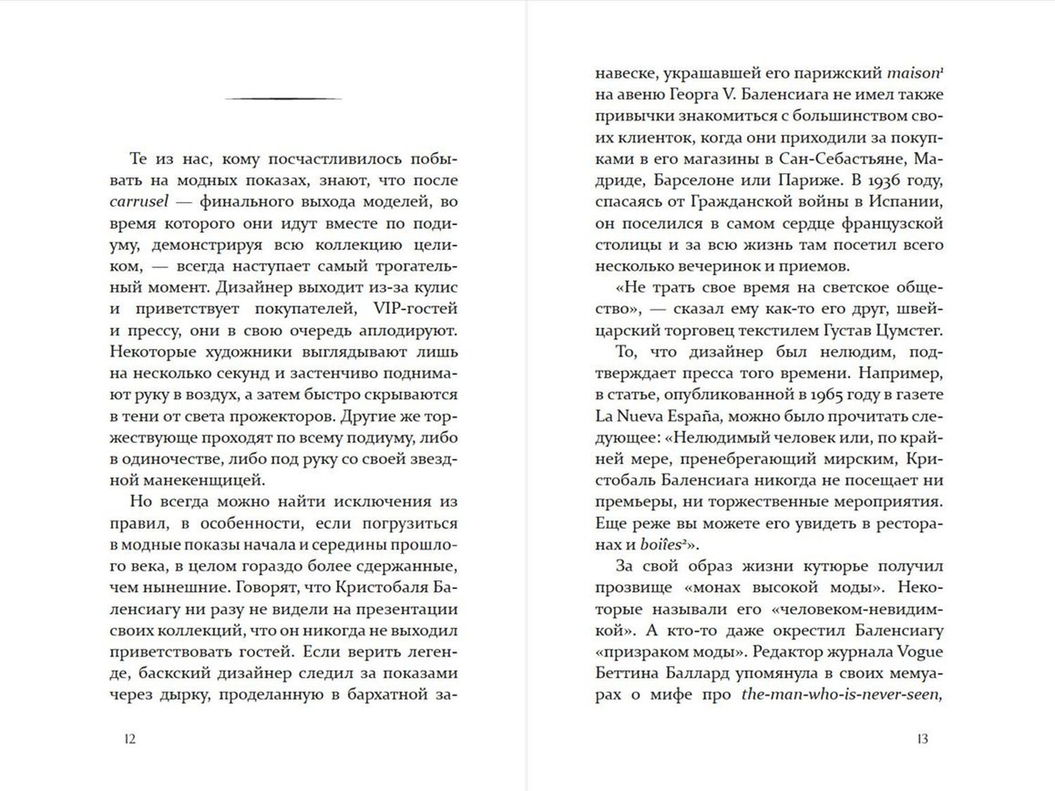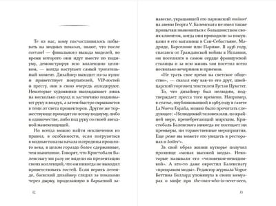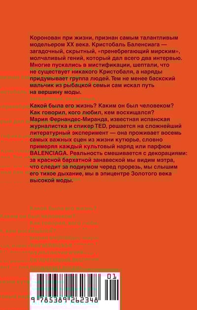 Все знают его работы, но никто не видел этого человека. Так говорили о великом и самом неизвестном кутюрье XX века — Кристобале Баленсиаге. Баскский гений не был публичной персоной, но все же — как жил монарх высокой моды? На этот вопрос пытается ответить Мария Миранда-Фернандес, журналистка и спикер TED. Она проживает восемь самых значимых сцен в жизни Кристобаля: вдыхает вместе с мальчиком морской воздух Гетарии, пока тот спешит показать первое платье заказчице, сочувствует именитым манекенщицам Balenciaga, что держат в руках письма о закрытии модного дома. Эта книга позволит узнать лучше авангардиста и отшельника Золотого века моды.