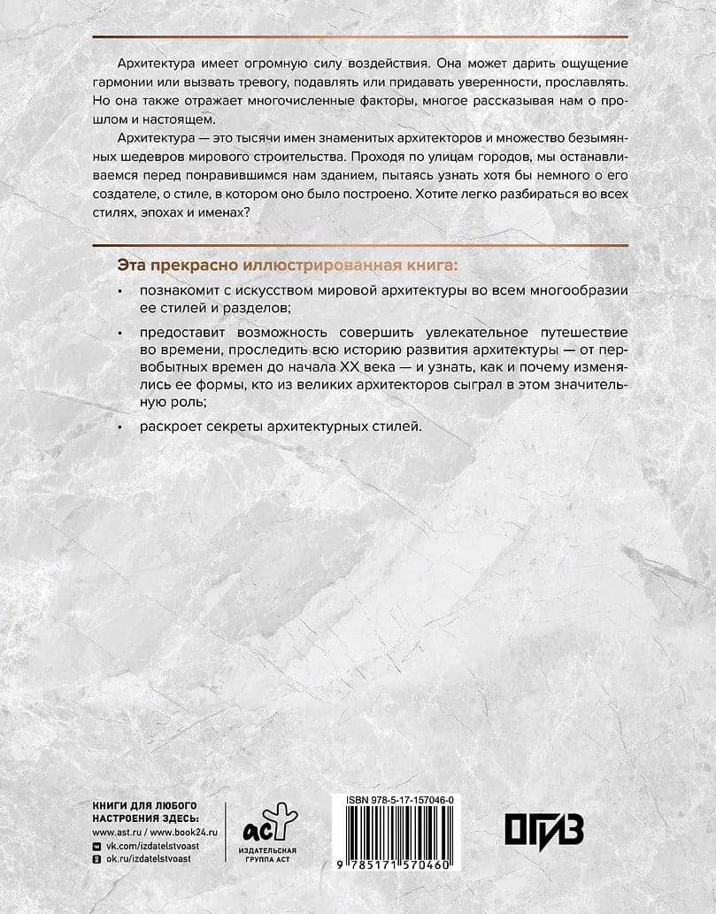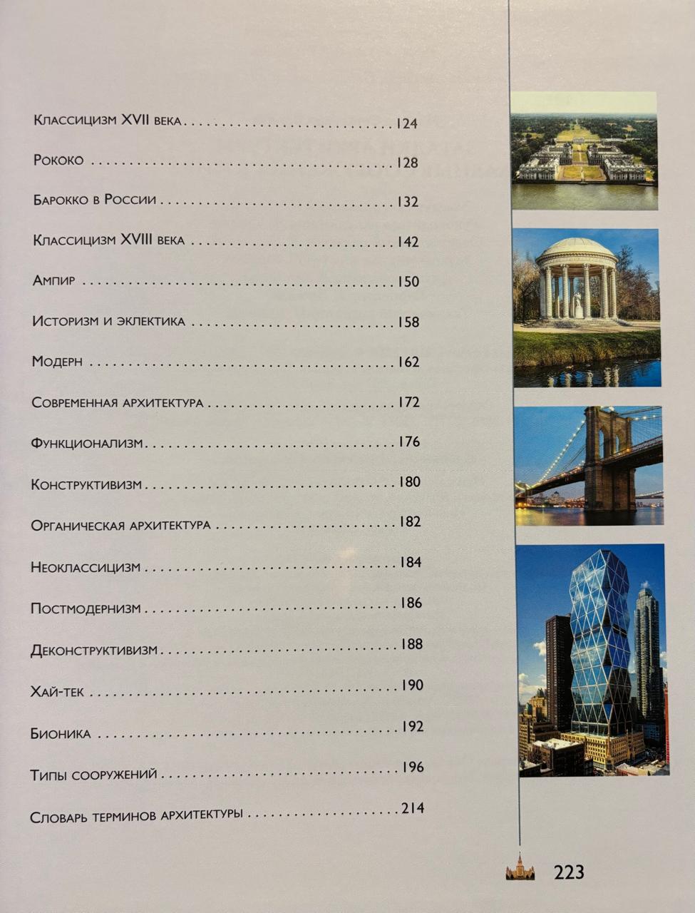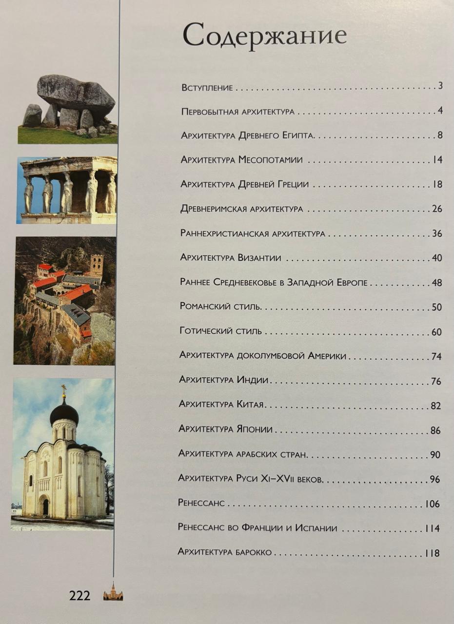 Архитектура имеет огромную силу воздействия. Она может дарить ощущение гармонии или вызывать тревогу, подавлять или придавать уверенности, прославлять. Но она также отражает многочисленные факторы, многое рассказывая нам о прошлом и настоящем. Это прекрасно иллюстрированное издание познакомит с искусством архитектуры во всем многообразии ее основных стилей, областей и разделов. Оно будет особенно интересно тем, кто хотел бы проследить всю историю развития архитектуры — от первобытных времен до начала XX века, — понять, как и почему изменились ее формы, кто из великих архитекторов сыграл в этом значительную роль. В книге также раскрываются секреты возведения самых знаменитых архитектурных сооружений, что дает возможность по-новому взглянуть на известные всему миру шедевры.