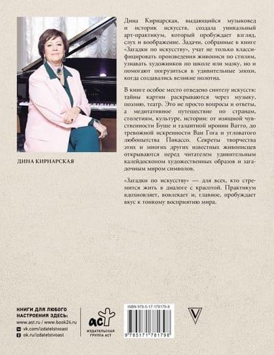 Дина Кирнарская, выдающийся музыковед и историк искусств, создала уникальный арт-практикум, который пробуждает взгляд, слух и воображение. Задачи, собранные в книге «Загадки по искусству», учат не только классифицировать произведения живописи по стилям, узнавать художников по школе или мазку, но и помогают погрузиться в удивительные эпохи, когда создавались великие полотна.