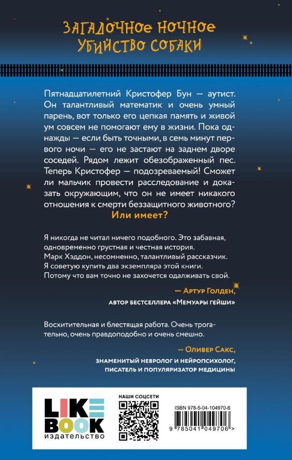 Пятнадцатилетний Кристофер Бун - аутист. Он талантливый математик и очень умный парень, вот только его цепкая память и живой ум совсем не помогают ему в жизни. Пока однажды, если быть точными, в семь минут первого ночи, его не застают на заднем дворе соседей. Рядом лежит обезображенный пес. Теперь Кристофер подозреваемый! Сможет ли мальчик провести расследование и доказать окружающим, что он не имеет никакого отношения к смерти беззащитного животного. Или имеет?