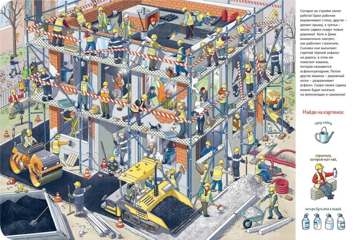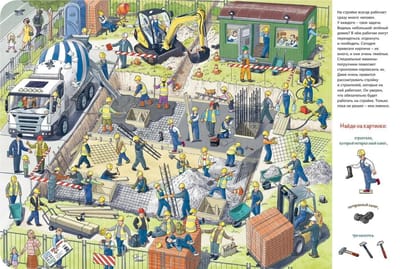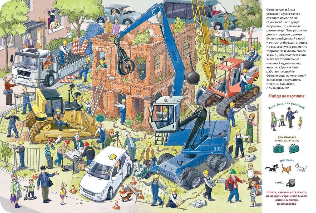 Рядом с домом Кати и Димы строят новый дом – здесь будет детский сад! Заглянем вместе с ребятами на стройку? Мы посмотрим, как идет строительство, и увидим, сколько всего интересного там происходит. На стройке всегда кипит работа. Здесь трудится множество рабочих. А сколько тут разных машин, инструментов и всевозможных приспособлений! Рассмотри книжку внимательно и найди каждое из них.