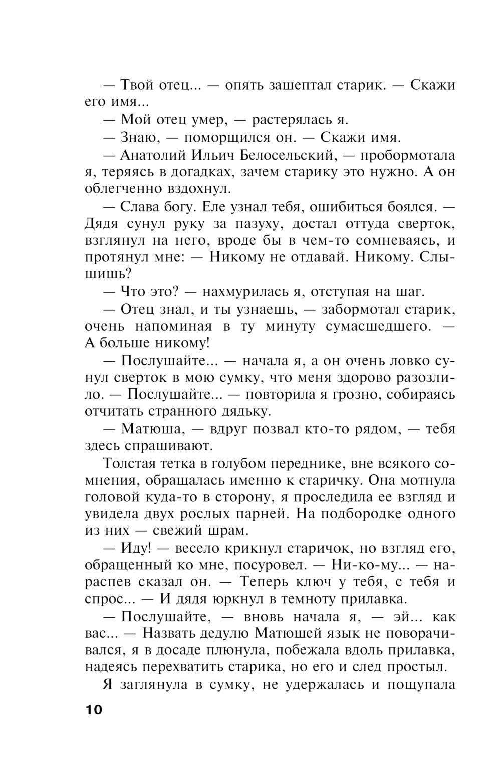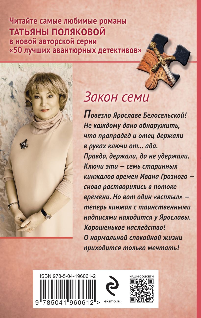 Повезло Ярославе Белосельской! Не каждому дано обнаружить, что прапрадед и отец держали в руках ключи от… ада. Правда, держали, да не удержали. Ключи эти — семь старинных кинжалов времен Ивана Грозного — снова растворились в потоке времени. Но вот один «всплыл» — теперь кинжал с таинственными надписями находится у Ярославы. Хорошенькое наследство! О нормальной спокойной жизни приходится только мечтать! А, кстати, где остальные кинжалы? Может, Ярославе удастся разгадать эту загадку? Но на пути ее ненависть, корысть и равнодушие — семь кругов ада человеческих отношений, и через них нужно пройти, чтобы найти… А что найти — это вопрос! Просто клад? Саму себя? Семейную тайну? Или… любовь?