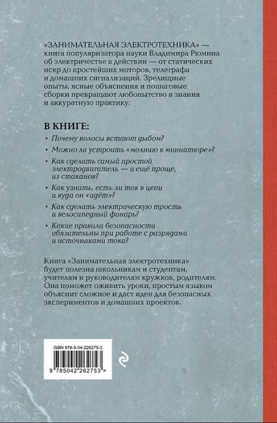 Владимир Рюмин — известный популяризатор науки — объясняет электричество просто и увлекательно. В книге — десятки демонстраций и сборок: от электрофора до простейшего электромотора, телеграфа и домашних сигнализаций — вы увидите электротехнику в действии.