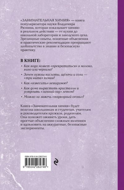 Владимир Рюмин — известный популяризатор науки — объясняет химию просто и увлекательно, превращая зрелищные опыты в понятные закономерности. В книге — десятки демонстраций: от «молока из воды» и исчезающих чернил до цветного пламени, «химического сада» и опытов с газами, которые позволят не только понять теорию, но и увидеть химию в действии.