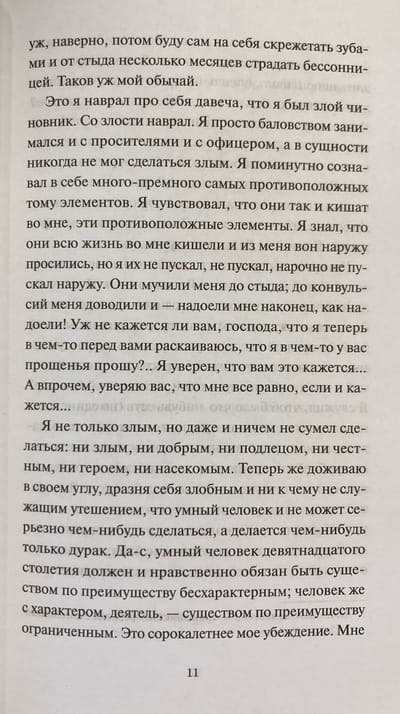 Безымянный герой умен, готов полемизировать с современниками и обличать пороки века, но выступает противоречивым и недостоверным рассказчиком. Мысленно возвращаясь к прошедшей молодости, он отслеживает свой трагичный, но закономерный путь к социальному подполью.