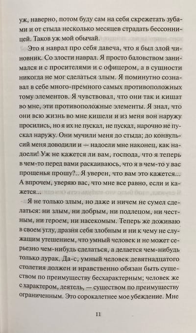 Безымянный герой умен, готов полемизировать с современниками и обличать пороки века, но выступает противоречивым и недостоверным рассказчиком. Мысленно возвращаясь к прошедшей молодости, он отслеживает свой трагичный, но закономерный путь к социальному подполью.