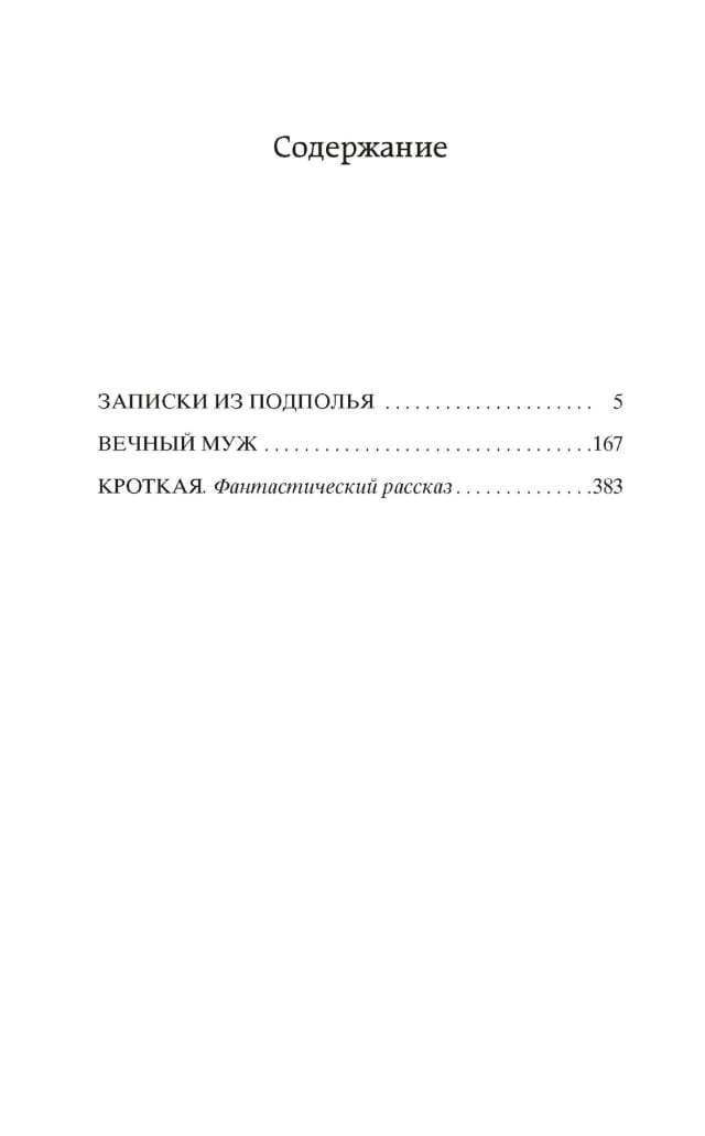 В настоящее издание вошли три повести Ф. М. Достоевского: «Записки из подполья», «Вечный муж» и «Кроткая». «Записки из подполья» — увертюра Достоевского к его пятикнижию, повесть точно поставленных вопросов и точно найденных интонаций. Боль пронизывает слово героя, одинокого, безымянного рассказчика, который ведет дневник, рассказывая о своей печальной жизни. Повести «Вечный муж» и «Кроткая» — своего рода психологические этюды, размышления писателя на тему любви и семейной жизни. Любовные драмы в обеих повестях становятся лишь основой для развития действия, в то время как внимание автора сосредоточено на исследовании двух человеческих типов — тирана и жертвы.