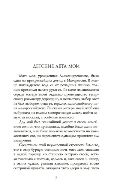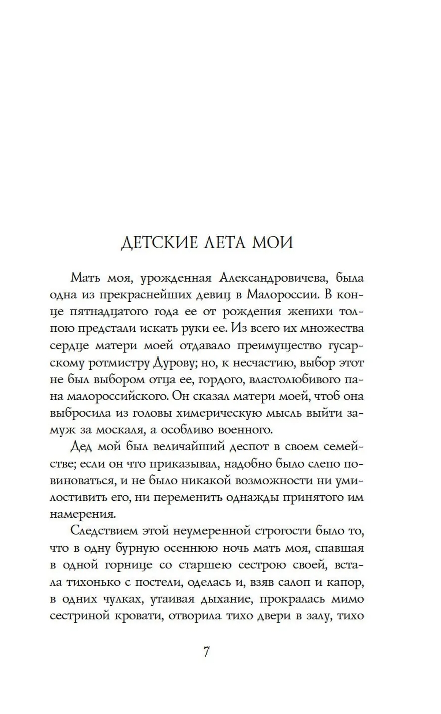 Наденьке не повезло: как только она появилась на свет, маменька сразу ее невзлюбила, потому что хотела сына, а родилась дочь. Поэтому воспитывалась девочка в отцовском полку, прекрасно скакала на лошади, умело обращалась с пистолетом и шпагой. Но время от времени маменька отлавливала дочь, словно дикого зверька, и приобщала к женским занятиям — вышиванию и вязанию под усыпляющее чтение книг.