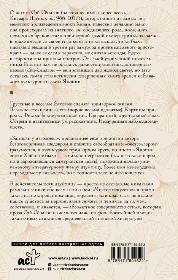 «Записки у изголовья», признанные еще при жизни автора безоговорочным шедевром и ставшие своеобразным «бестселлером» (разумеется, в очень узком придворном кругу, но иного в Японии эпохи Хэйан не было — тотально неграмотен был не только народ, но и зарождавшаяся самурайская знать), положили начало уникальному литературному жанру «дзуйхицу», более или менее удачно переводимому как «эссе», но в точности эссе не являющемуся. В действительности «дзуйхицу» — просто не скованные никакими рамками записи обо всем и ни о чем. «Чистое искусство» в прямо-таки дистиллированном виде, «красота ради красоты», не пытающаяся спастись за перипетиями сюжета и ценимая за то, чем, собственно, и является, — абсолютное совершенство стиля, которым проза Сэй-Сёнагон выделяется даже на фоне богатейшей плеяды талантливых стилистов средневековой японской литературы.