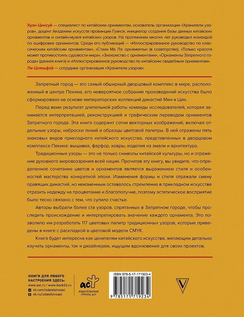 Перед вами результат длительной работы команды исследователей, которая занимается интерпретацией, реконструкцией и графическим переводом орнаментов Запретного города. Эта книга содержит сотни векторных изображений, включая отдельные узоры, наброски линий и образцы цветовой палитры. В ней отражены пять знаковых видов прикладного китайского искусства, представленных в дворцовом комплексе Пекина: вышивка, фарфор, ковры, изделия из эмали и архитектура.