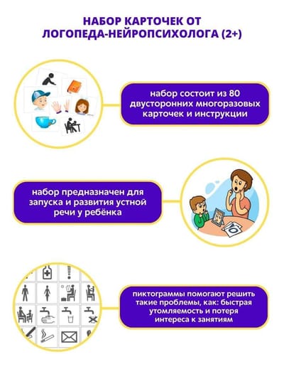 Набор предназначен для запуска и развития устной речи у ребёнка. Он состоит из 80 двусторонних многоразовых карточек и буклета с подробной инструкцией.