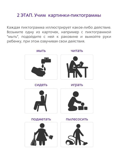 В наборе собраны изображения разных предметов, людей, животных и пр., а также пиктограммы, иллюстрирующие действия человека. Мозг ребёнка нейропластичен, поэтому дети легко обучаемы, но для них характерны быстрая утомляемость и потеря интереса к занятиям, а использование пиктограмм помогает решить эти проблемы. Карточки многофункциональны, они развивают не только речь ребёнка, но и другие высшие психические функции: внимание, память, воображение, мышление, восприятие, что способствует всестороннему развитию малыша и помогает на время переключить внимание ребёнка с одного вида деятельности на другой, сохранив его интерес к занятиям. Занятия с карточками научат вашего малыша сочетать слова друг с другом, составлять предложения, а в дальнейшем – придумывать развёрнутые рассказы.