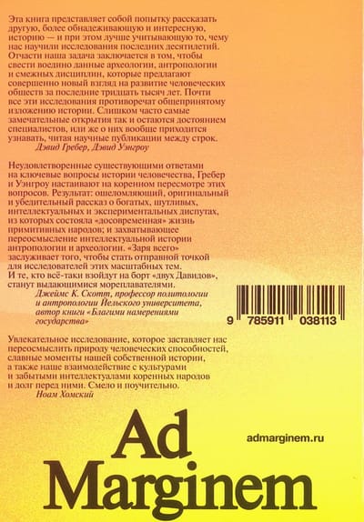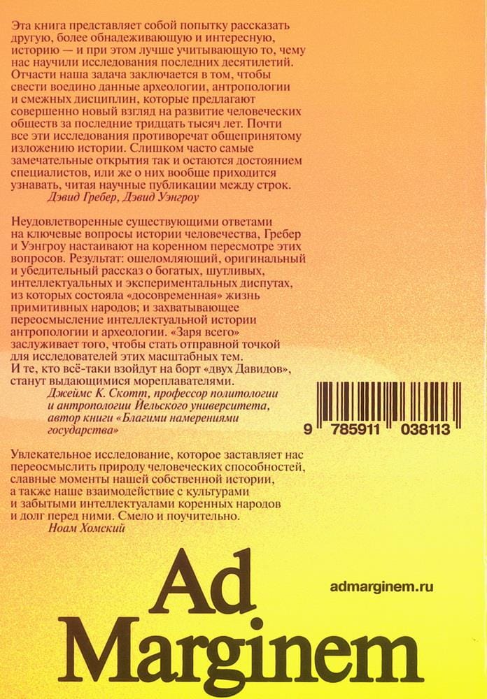 Антрополог Дэвид Гребер и археолог Дэвид Уэнгроу заново складывают пазл истории человечества, бросая вызов доминирующим представлениям о развитии общества как о движении от эгалитарных групп охотников-собирателей — через аграрную революцию и урбанизацию — к созданию иерархических государств. По мнению авторов, этот традиционный нарратив не имеет ничего общего с фактами, а лишь воспроизводит мифы, укоренившиеся в исторической науке. Возможно, человечество идет совсем по другому пути. Основываясь на данных археологии, антропологии и смежных дисциплин, полученных за последние десятилетия, мнении индигенных мыслителей, Гребер и Уэнгроу предлагают посмотреть на социальную историю извне западного канона. Авторы объективно оценивают амбициозность своей задачи — на осмысление новой картины и принятие ее наукой уйдут годы, тем важнее уже сейчас произвести понятийный сдвиг. «Заря всего» возникла как своего рода игра, неформальная дискуссия антрополога и археолога об истории человечества, и превратилась в захватывающее интеллектуальное путешествие.