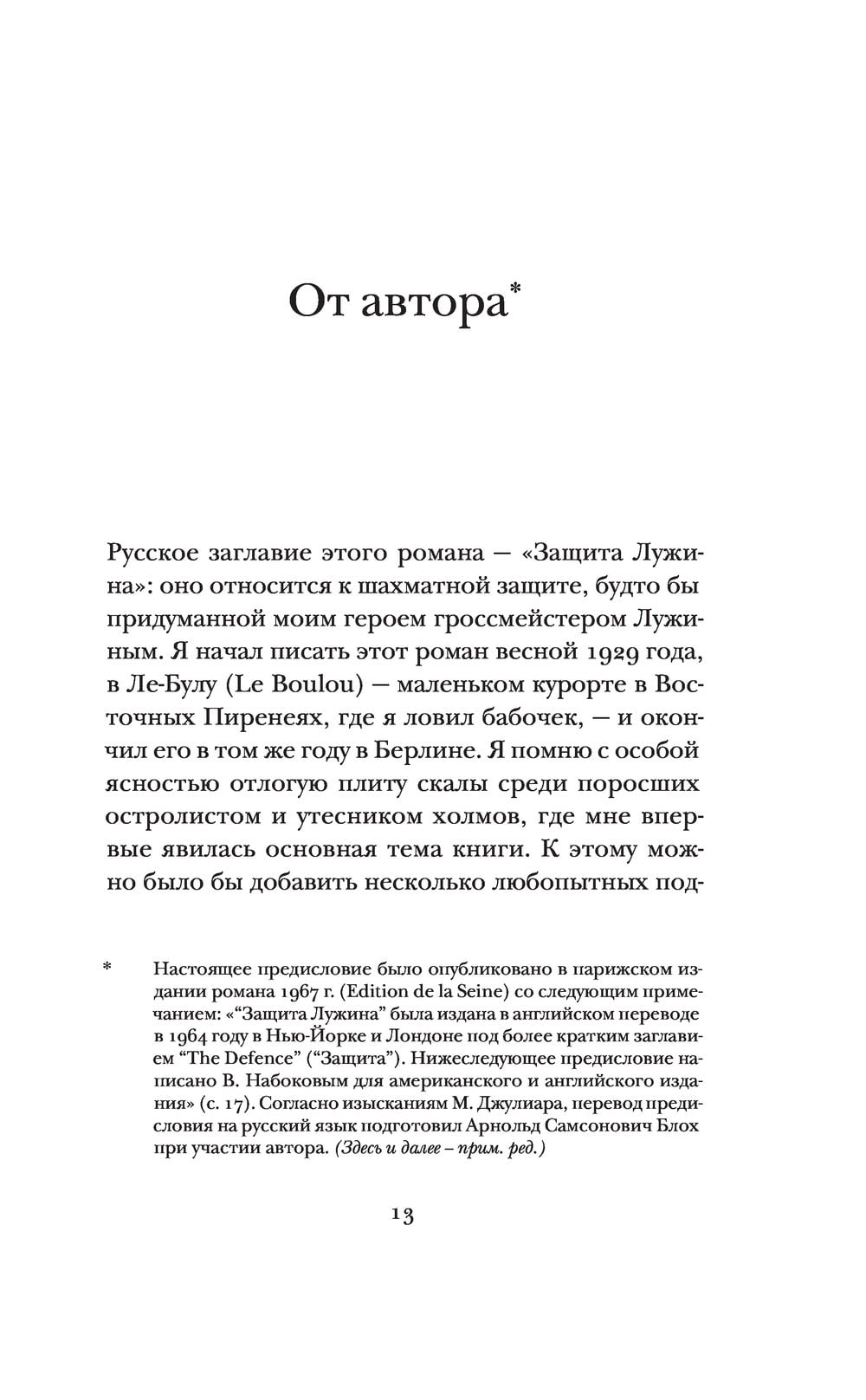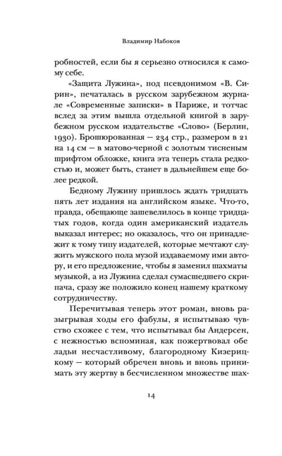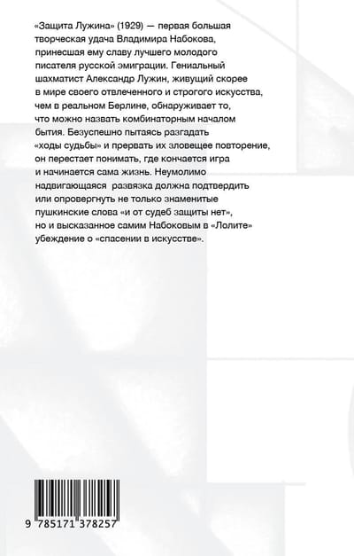 «Защита Лужина» (1929) — вершинное достижение Владимира Набокова 20‑х годов, его первая большая творческая удача, принесшая ему славу лучшего молодого писателя русской эмиграции. Показав, по словам Глеба Струве, «колдовское владение темой и материалом», Набоков этим романом открыл в русской литературе новую яркую страницу.