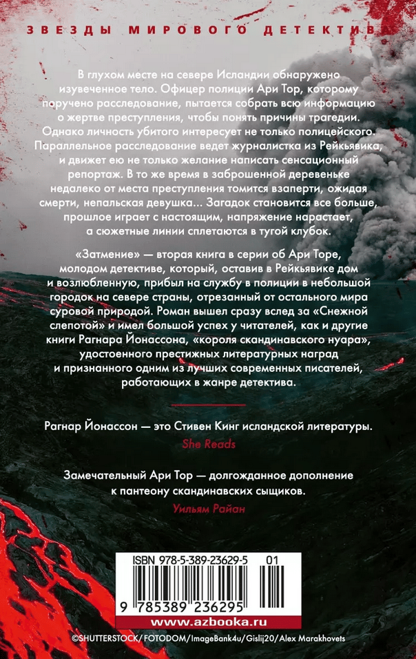 В глухом месте на севере Исландии обнаружено изувеченное тело. Офицер полиции Ари Тор, которому поручено расследование, пытается собрать всю информацию о жертве преступления, чтобы понять причины трагедии. Однако личность убитого интересует не только полицейского. Параллельное расследование ведет журналистка из Рейкьявика, и движет ею не только желание написать сенсационный репортаж. В то же время в заброшенной деревеньке недалеко от места преступления томится взаперти, ожидая смерти, непальская девушка… Загадок становится все больше, прошлое играет с настоящим, напряжение нарастает, а сюжетные линии сплетаются в тугой клубок. «Затмение» — вторая книга в серии об Ари Торе, молодом детективе, который, оставив в Рейкьявике дом и возлюбленную, прибыл на службу в полиции в небольшой городок на севере страны, отрезанный от остального мира суровой природой. Роман вышел сразу вслед за «Снежной слепотой» и имел большой успех у читателей, как и другие книги Рагнара Йонассона, «короля скандинавского нуара», удостоенного престижных литературных наград и признанного одним из лучших современных писателей, работающих в жанре детектива.