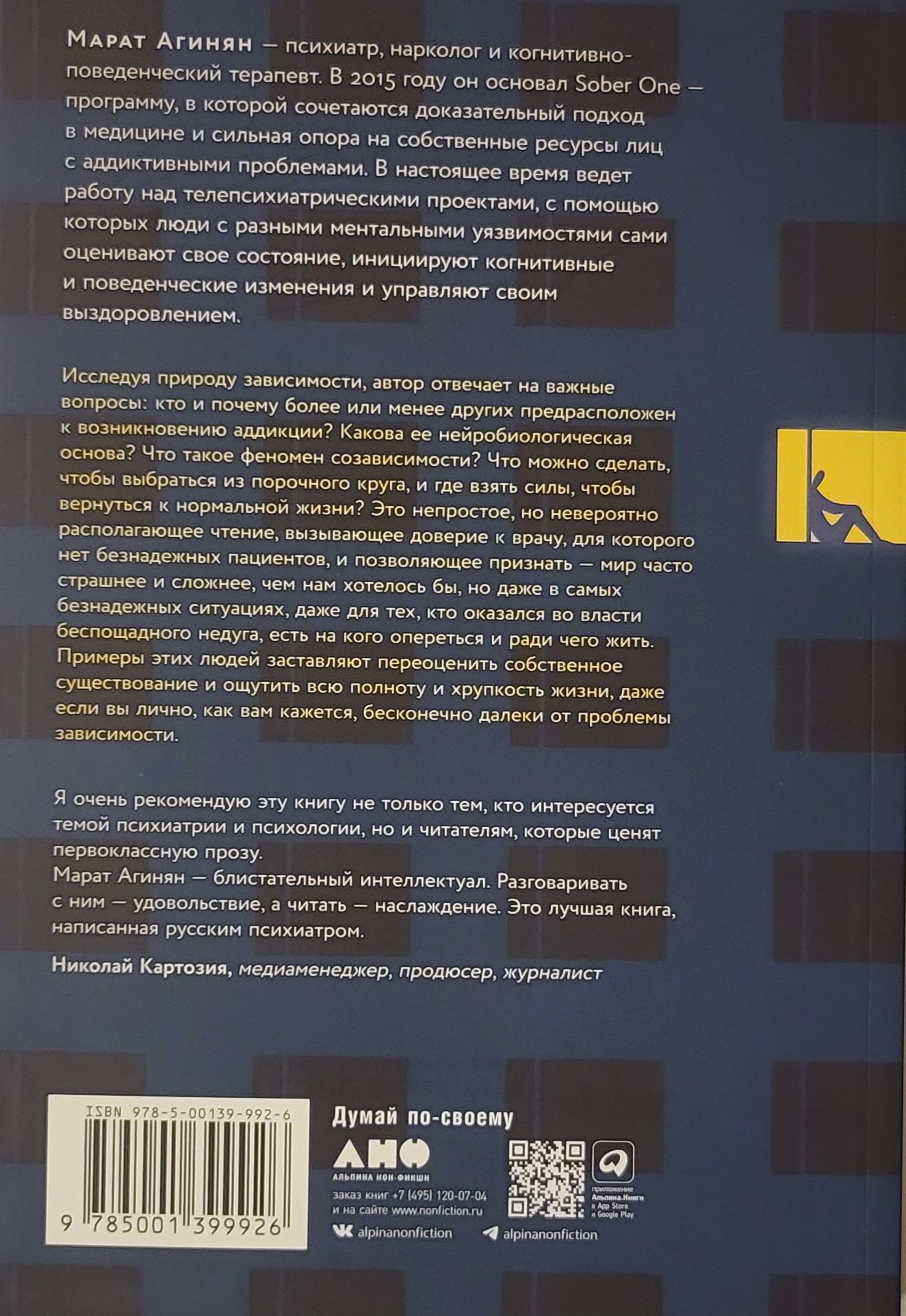 По мнению автора, недуг преодолевают не те, кто обладает исключительным интеллектом или железной волей, а те, кто каждый день, шаг за шагом, делает то, что положено делать. В книге «Зависимость и ее человек» автор рассказывает реальные истории людей, дошедших до самого дна и сломавших не только свою, но и чужие жизни. Не всем им удалось выжить и спастись, но тем ценнее опыт тех, кто вопреки всему смог преодолеть зависимость и выйти на путь уверенного выздоровления.