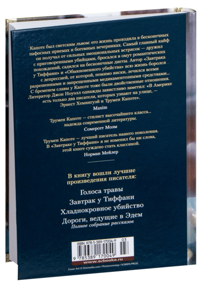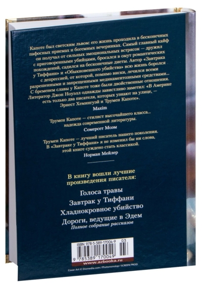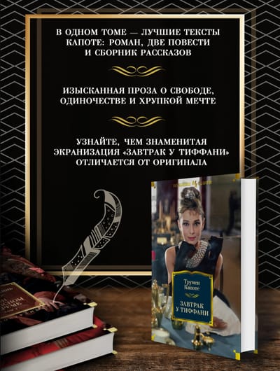 «Трумен Капоте — стилист высочайшего класса… надежда современной литературы», — писал Сомерсет Моэм. А Норман Мейлер говорил: «Трумен Капоте — лучший писатель нашего поколения, — и добавлял: — В «Завтраке у Тиффани» я не изменил бы ни слова, этой книге суждено стать классикой». В данный том входят и «Завтрак у Тиффани» (самое знаменитое произведение Капоте, прославленное в 1961 году экранизацией с Одри Хепберн в главной роли), и лирическая повесть «Голоса травы», и монументальный роман «Хладнокровное убийство», основанный на истории реального преступления и породивший новый жанр «романа-репортажа», и полное собрание рассказов этого выдающегося мастера американской литературы XX века.
