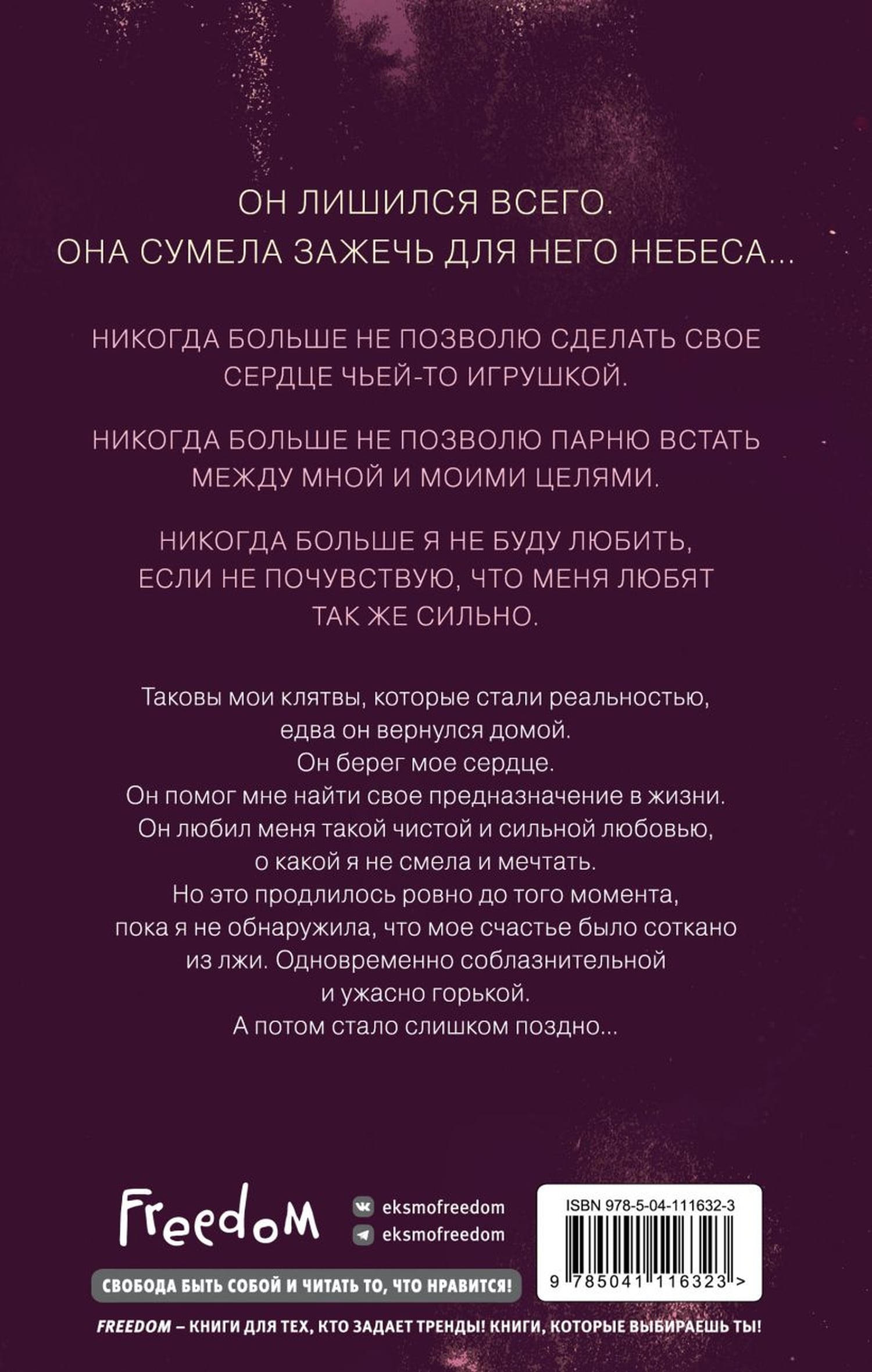 Никогда больше я не буду любить, если не почувствую, что меня любят так же сильно. Таковы мои  клятвы, которые стали реальностью, едва он вернулся домой. Он берег мое сердце. Он помог найти мне свое предназначение в жизни. Он любил меня такой чистой и сильной любовью, о какой я не смела и мечтать. Но это продлилось ровно до того момента, пока я не обнаружила, что мое счастье было соткано из лжи. Одновременно соблазнительной и ужасно горькой. А потом стало слишком поздно...