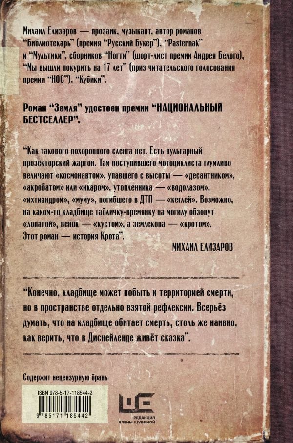 Михаил Елизаров — автор романов “Библиотекарь” (премия “Русский Букер"), “Pasternak” и “Мультики” (шорт-лист премии “Национальный бестселлер”), сборников рассказов “Ногти” (шорт-лист премии Андрея Белого), “Мы вышли покурить на 17 лет” (приз читательского голосования премии “НОС”).