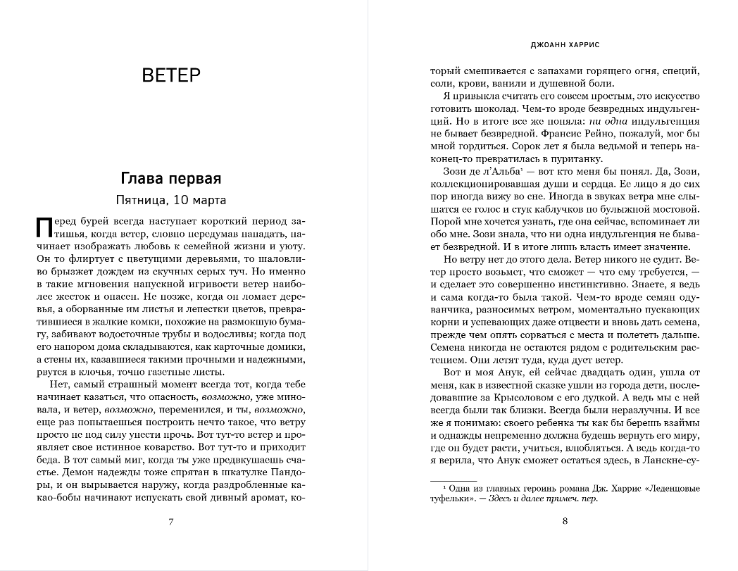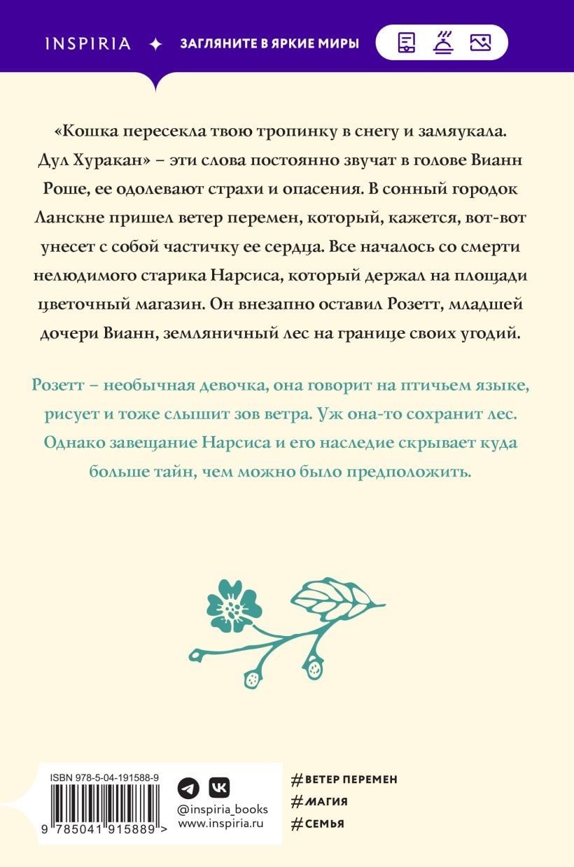 «Кошка пересекла твою тропинку в снегу и замяукала. Дул Хуракан...» — эти слова постоянно звучат в голове Вианн Роше, которую одолевают страхи и опасения. В сонный городок Ланскне пришел ветер перемен, который, кажется, вот-вот унесет с собой частичку ее сердца. Все началось со смерти нелюдимого старика Нарсиса, что держал на площади цветочный магазин. Он внезапно оставил Розетт, младшей дочери Вианн, земляничный лес на границе своих угодий. Розетт — необычная девочка, особенная, говорит на птичьем языке, рисует и тоже слышит зов ветра. Уж она-то сохранит лес.