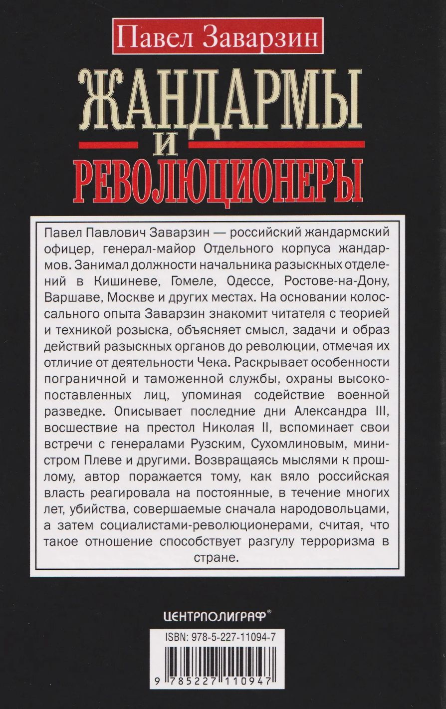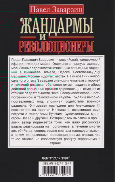Павел Павлович Заварзин — российский жандармский офицер, генерал-майор Отдельного корпуса жандармов. Занимал должности начальника разыскных отделений в Кишиневе, Гомеле, Одессе, Ростове-на-Дону, Варшаве, Москве и других местах. На основании колоссального опыта Заварзин знакомит читателя с теорией и техникой розыска, объясняет смысл, задачи и образ действий разыскных органов до революции, отмечая их отличие от деятельности ЧЕКА. Раскрывает особенности пограничной и таможенной службы, охраны высокопоставленных лиц, упоминая содействие военной разведке. Описывает последние дни Александра III, восшествие на престол Николая II, вспоминает свои встречи с генералами Рузским, Сухомлиновым, министром Плеве и другими. Возвращаясь мыслями к прошлому, автор поражается тому, как вяло российская власть реагировала на постоянные, в течение многих лет, убийства, совершаемые сначала народовольцами, а затем социалистами-революционерами, считая, что такое отношение способствует разгулу терроризма в стране.