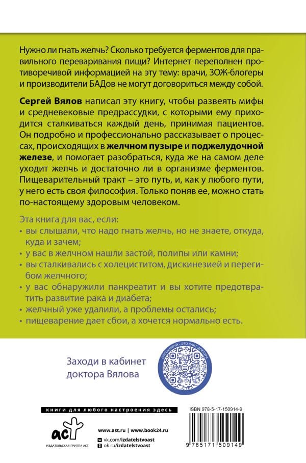 Нужно ли гнать желчь? Сколько требуется ферментов для правильного переваривания пищи? Интернет переполнен противоречивой информацией на эту тему: врачи, ЗОЖ-блогеры и производители БАДов не могут договориться между собой. Известный гастроэнтеролог и гепатолог Сергей Вялов написал эту книгу, чтобы развеять мифы и средневековые предрассудки, с которыми ему приходится сталкиваться каждый день, принимая пациентов. Он подробно и профессионально рассказывает о процессах, происходящих в желчном пузыре и поджелудочной железе, и помогает разобраться, куда же на самом деле уходит желчь и достаточно ли в организме ферментов. Пищеварительный тракт - это путь, и как у любого пути, у него есть своя философия. Только поняв ее, можно стать по-настоящему здоровым человеком.
