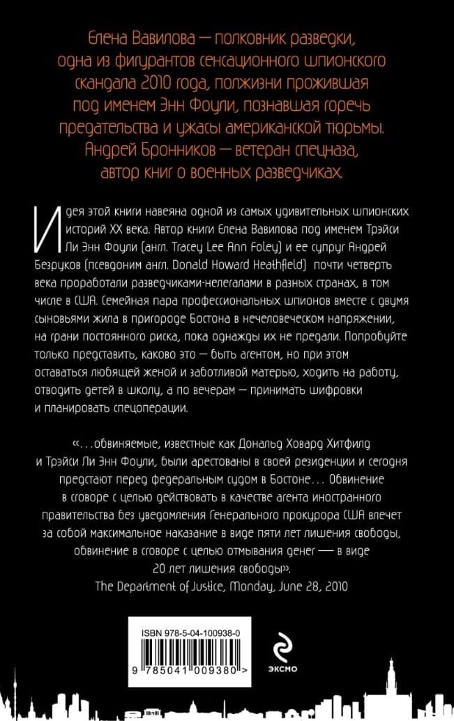 Идея этой книги навеяна одной из самых удивительных шпионских историй XX века. Автор книги Елена Вавилова под именем Трэйси Ли Энн Фоули и ее супруг Андрей Безруков почти четверть века проработали разведчиками-нелегалами в разных странах, в том числе США. Семейная пара профессиональных шпионов вместе с двумя сыновьями жили в пригороде Бостона в нечеловеческом напряжении, на грани постоянного риска, пока однажды их не предали. Попробуйте только представить, каково это – быть агентом, но при этом оставаться любящей женой и заботливой матерью, ходить на работу, отводить детей в школу, а по вечерам – принимать шифровки и планировать спецоперации.
