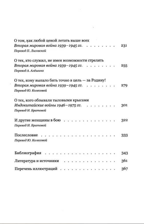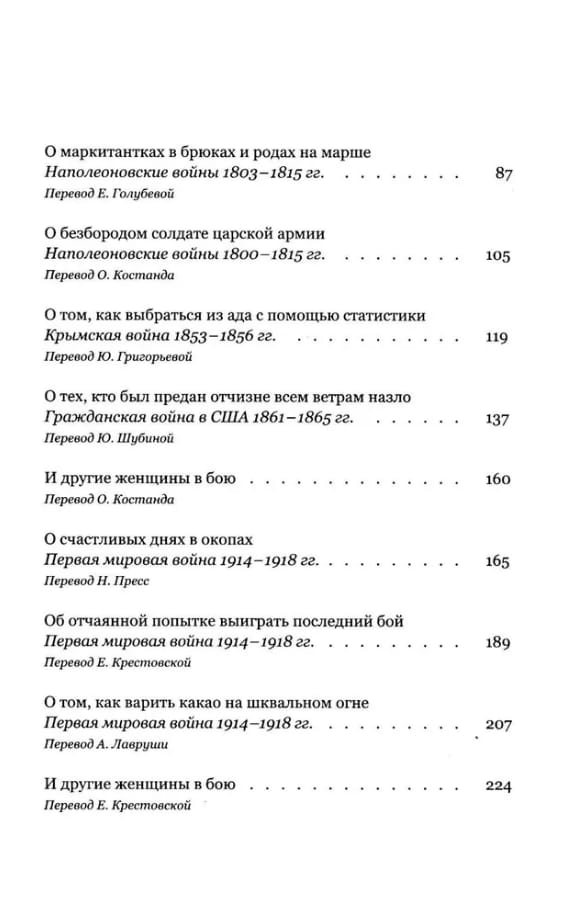 В книге Анны Ларсдоттер множество ярких портретов женщин — участниц войн XVII–XX вв.: солдат английской армии Ханна Снелл, икона борьбы с рабством Гарриет Табмен, медсестра и выдающийся организатор военной медицины Флоренс Найтингейл, основательница женского ударного батальона Мария Бочкарева, ветеран вьетнамской войны Линда Ван Девантер и другие.