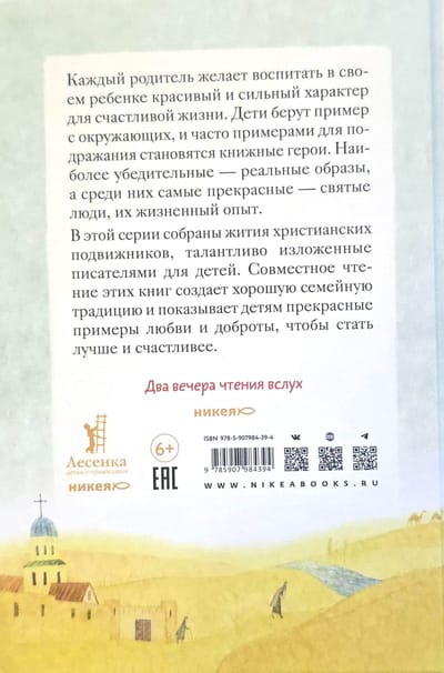 Каждый родитель желает воспитать в своем ребенке красивый и сильный характер для счастливой жизни. Дети берут пример с окружающих, и часто образами для подражания становятся книжные герои. Наиболее убедительные — реальные образы, а среди них самые прекрасные — образы святых людей, их жизненный опыт. В этой серии собраны жития христианских подвижников, талантливо изложенные писателями для детей. Совместное чтение этих книг создает хорошую семейную традицию и дает детям прекрасные примеры любви и доброты, чтобы стать лучше и счастливее.