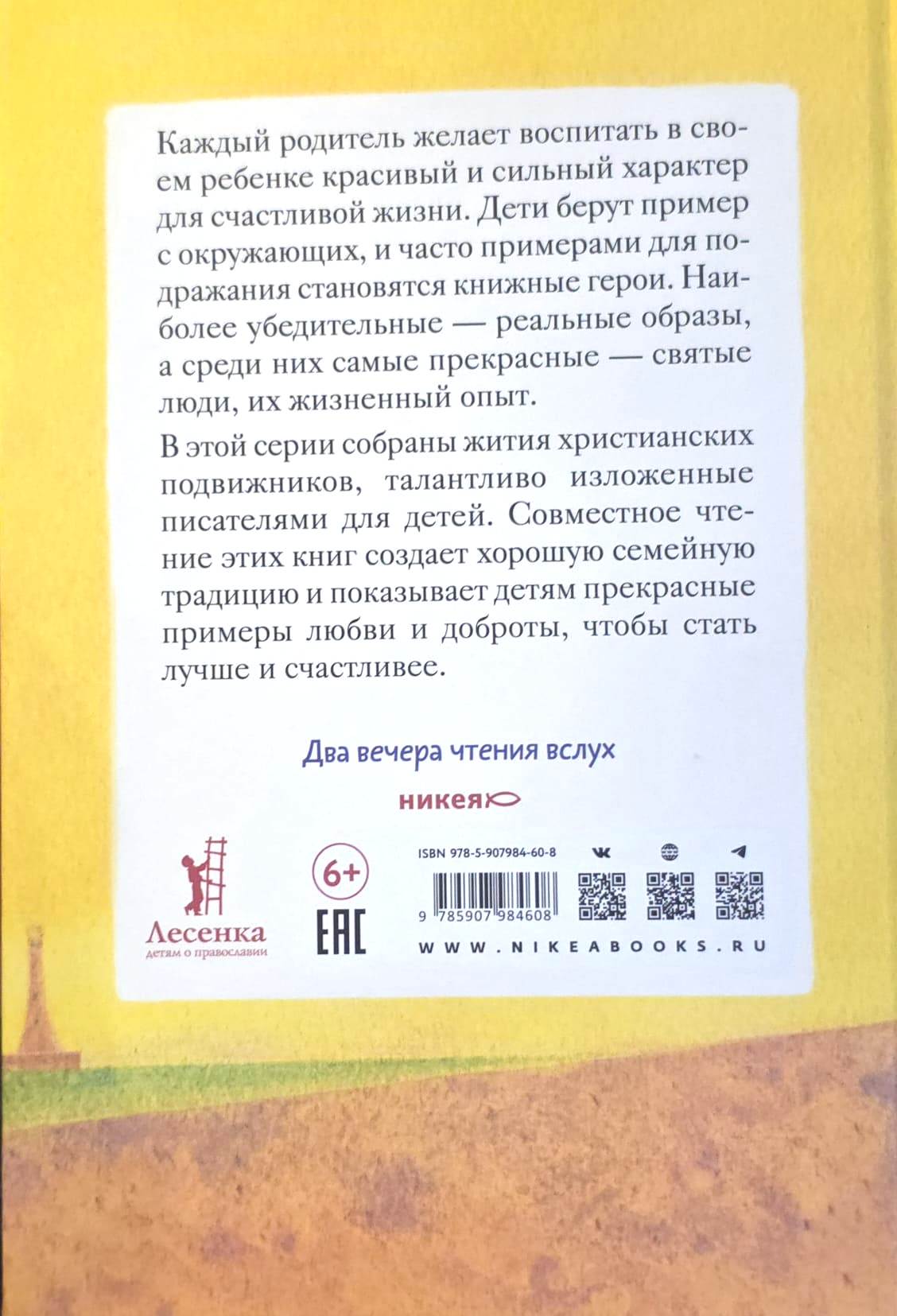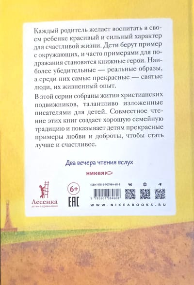 Каждый родитель желает воспитать в своем ребенке красивый и сильный характер для счастливой жизни. Дети берут пример с окружающих, и часто образами для подражания становятся книжные герои. Наиболее убедительные — реальные образы, а среди них самые прекрасные — образы святых людей, их жизненный опыт. В этой серии собраны жития христианских подвижников, талантливо изложенные писателями для детей. Совместное чтение этих книг создает хорошую семейную традицию и дает детям прекрасные примеры любви и доброты, чтобы стать лучше и счастливее.