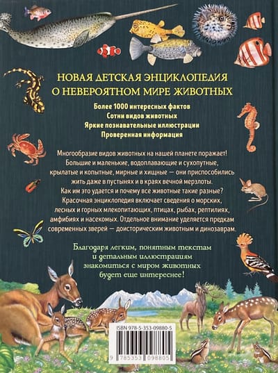 Эта книга познакомит читателя с удивительным миром животных. В ней рассказывается о самых невероятных существах, обитающих во всех уголках Земли, а также содержатся интересные сведения о жизни на нашей планете задолго до появления людей. Превосходные иллюстрации дают наглядное представление как о современных животных, так и о тех, что вымерли много миллионов лет назад.