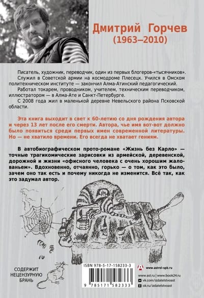 Эта книга выходит в свет к 60-летию со дня рождения автора и через 13 лет после его смерти. Автора, чье имя вот-вот должно было появиться среди первых имен современной литературы. Но — не хватило времени. Его всегда не хватает гениям.В автобиографическом прото-романе «Жизнь без Карло» — точные трагикомические зарисовки из армейской, деревенской, дорожной и жизни «офисного человека с очень хорошим жалованьем». Вдохновенно, отчаянно, горько — о том, как это было, зачем оно так есть и почему никогда не изменится. Всё так, как это задумал автор.Об авторе:Дмитрий Горчев (1963–2010). Писатель, художник, переводчик, один из первых блогеров-»тысячников». Родился в Казахстане, окончил Алма-Атинский педагогический институт иностранных языков (ныне Казахский университет международных отношений и мировых языков). В конце 90-х переехал в Петербург и работал главным художником издательства «Ге ликон Плюс» и журнала Бориса Стругацкого «Полдень. XXI  век». С  1999 по 2013 год издано 14 авторских сборников. Был одним из гостей легендарной «Школы злословия». С 2008 года жил в маленькой деревне Невельского района Псковской области.