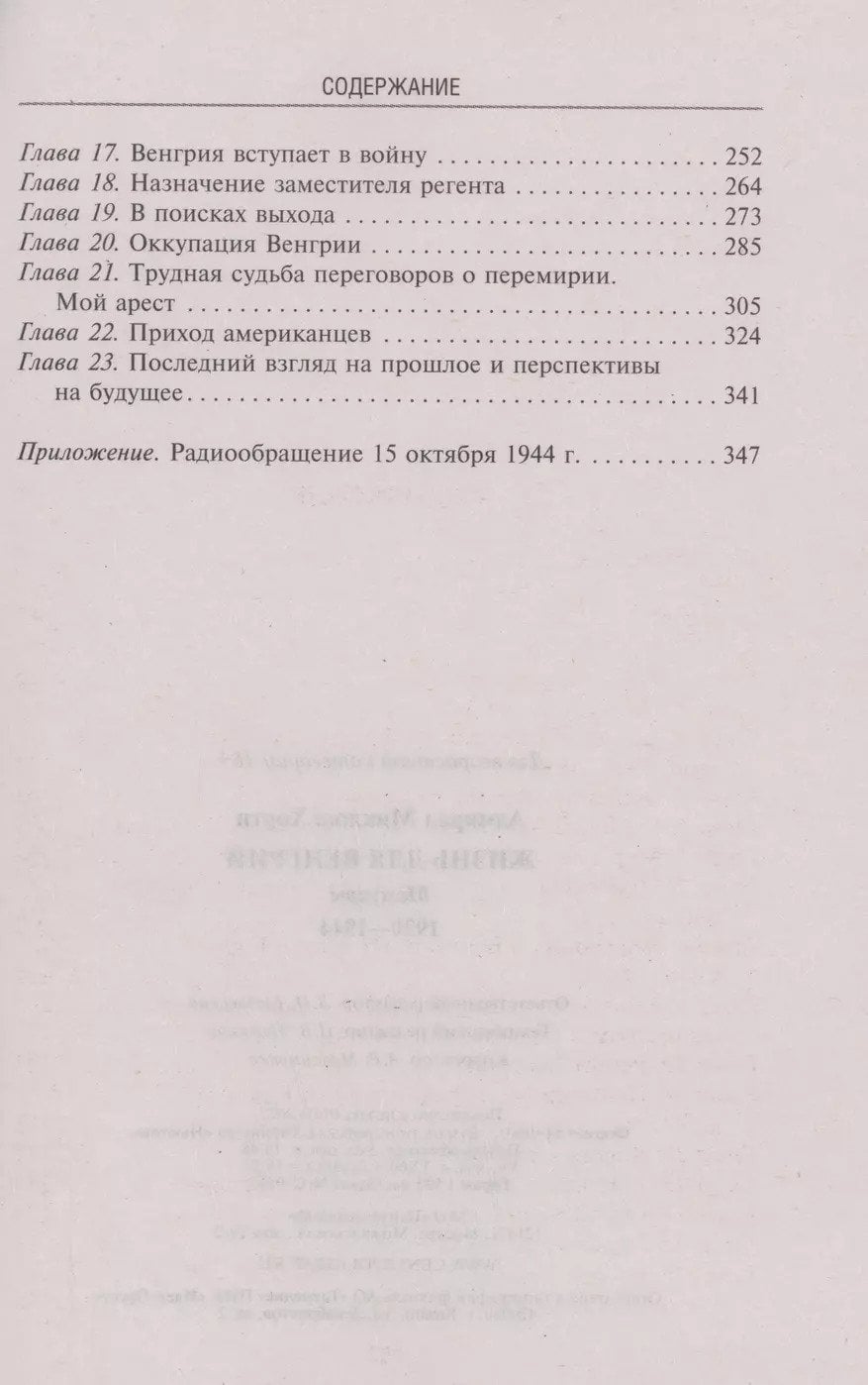 Адмирал Николас Хорти занимал пост регента Королевства Венгрия с 1 марта 1920 года по 15 октября 1944 года. Исполняя обязанности регента, Хорти пытался проводить политику восстановления Венгрии в ее прежних, до крушения Австро-Венгерской империи границах. Эта политика, в конечном счете, привела его к союзу с Гитлером. В результате Венгрия вернула себе часть своих исконных земель в Сербии, Хорватии, Словакии и Румынии. Но за это надо было платить, и венгерские соединения отправились на Восточный фронт, где понесли значительные потери. Вскоре Хорти понял неотвратимость поражения войск стран «оси» и начал тайные переговоры с союзниками. Однако вывести страну из войны ему не удалось. Война закончилась для Венгрии только с приходом советских войск, которые Хорти считал врагами и оккупантами. Мемуары Хорти — это рассказ регента королевства без короля и адмирала без флота о своей жизни и о том, как он вел борьбу за свою страну в господствовавшей в Европе атмосфере конфликтов, зависти и ненависти.