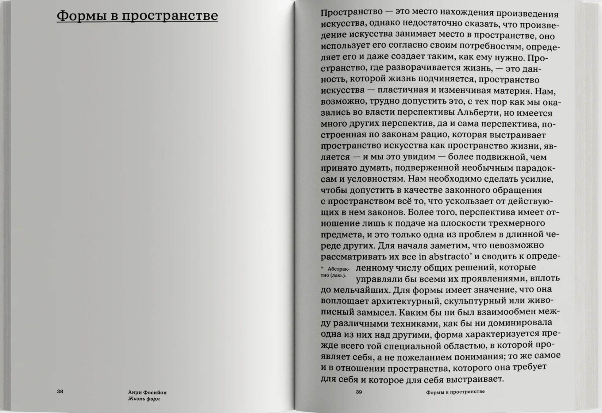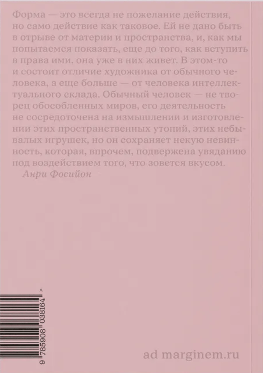 Книга классика французской и американской традиций истории искусства Анри Фосийона (1881–1943) «Жизнь форм» (1934) является квинтэссенцией его теории формы. Художественная форма представляется Фосийону не знаком и не идеей, а живым метаморфозом в пространстве, материи, сознании и времени, — и составляет «смыслы, исходящие от нее самой». Продолжая идеи немецких формалистов (Вёльфлин, Гильдебранд) и вдохновляясь бергсоновским витализмом, автор рассматривает жизнь художественных форм в тройном цикле: эксперименты (пробы), «классический» баланс (которому иногда на смену приходит рафинированность) и «барочный» распад. Эта формальная жизнь, по мнению Фосийона, «порождает новые условия для исторической, социальной и нравственной жизни» человека. Такой подход позволяет также избавить понятия стиля, материалов и техник в искусстве от присущей им часто инертности и увидеть их активный, созидательный или разрушительный, потенциал.
