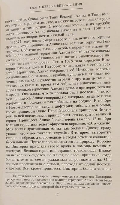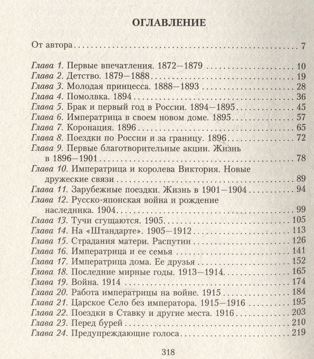 Баронесса Буксгевден (1883—1956), первый биограф русской императрицы, долгие годы была не только фрейлиной, но и преданным другом царской семьи. София Карловна, дочь русского посланника в Дании, с большой любовью, но беспристрастно рассказывает о жизни гессенской принцессы с раннего детства до последних дней. Иза, как называли баронессу при дворе, с 1913 г. неотлучно пребывала при Александре Федоровне до ссылки Романовых в Тобольск, а затем последовала за ними. Софии Карловне удалось запечатлеть множество зарисовок из жизни патронессы в счастливые времена и в дни великих печалей и горестей, сохранить бесценные сведения о взаимоотношениях в семье, подметить черты характера августейшей четы и их детей, описать особенности быта и передать атмосферу жизни при дворе. На страницах книги Александра Федоровна предстает не только как государыня, но, прежде всего, как любящая мать и жена, добрый друг и щедрая благотворительница, неустанно трудившаяся на благо своей страны и принявшая мученическую смерть вместе со всей семьей.