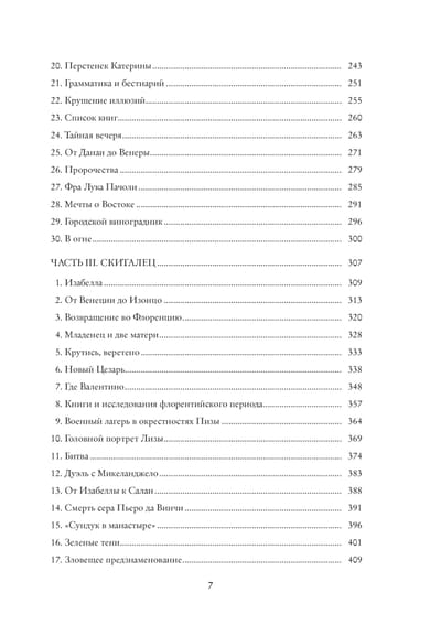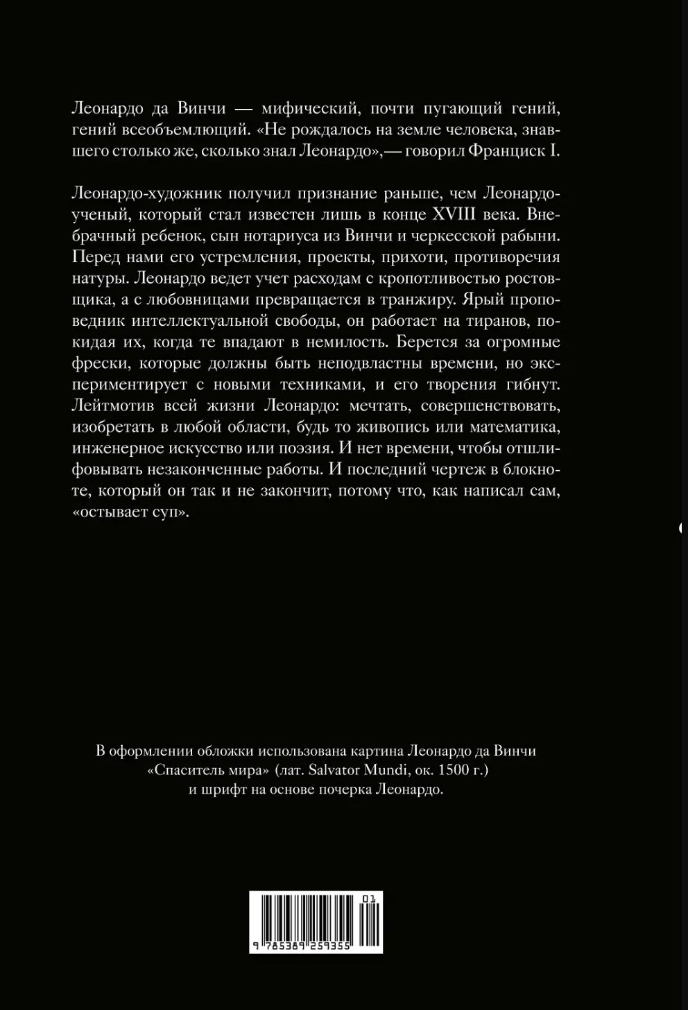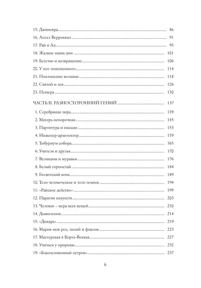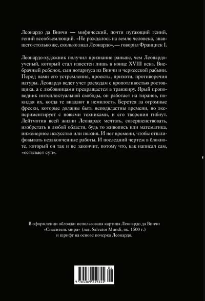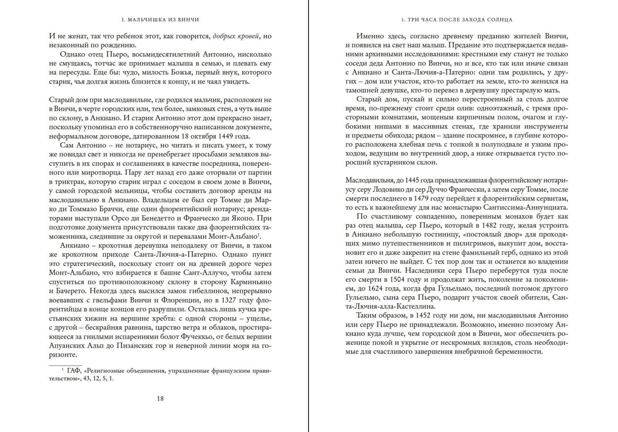 Как смог я рассказать эту историю? Прежде всего – прислушавшись к голосам современников самого Леонардо, свидетельствам неполным, зато полученным из первых уст,.. воспоминаниям тех, кто знал его лично, к документам и бумагам родных, контрактам, письмам, хроникам, налоговым декларациям, доносам и материалам судебных процессов, отчетам послов, записным книжкам художников и инженеров, славословиям придворных поэтов, путевому дневнику кардинальского секретаря.