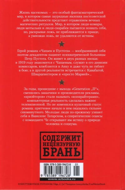Виктор Пелевин — один из самых известных современных писателей, чьи романы 1990-х годов, собранные в этом томе, во многом повлияли на развитие российской литературы. Реальность, переплетенная с фантасмагорией, эксцентричность фабулы, соединение разнородных приемов стали залогом неизменного успеха произведений В. Пелевина у читателей. Жизнь насекомых — это особый фантасмагорический мир, в котором самые заурядные явления постсоветской действительности предстают отражением вечных магических ритуалов. Мир, в котором люди-комары, люди-мотыльки и люди-скарабеи пытаются познать себя, но, раскрывая ложь, не приближаются к правде, а, умножая ложь, не удаляются от истины. Герой романа «Чапаев и Пустота» — вообразивший себя поэтом-декадентом пациент психиатрической больницы Петр Пустота. Он живет в двух разных эпохах: в 1919 году знакомится с Чапаевым, служит в его дивизии комиссаром, влюбляется в Анку и даже чуть не гибнет в бою; а в другой реальности встречается с Кавабатой, Шварценеггером и «просто Марией»... За годы, прошедшие с выхода «Generation “П”«, сменились заказчики и производители рекламы, компьютерная реальность сделалась важнее телевизионной. Но не изменился культовый статус романа: притчевое начало в нем оказалось сильнее сиюминутного. Молодые люди по-прежнему узнают себя в Вавилене Татарском, а спиритические сеансы с команданте Че открывают им истину о природе человека и социума.