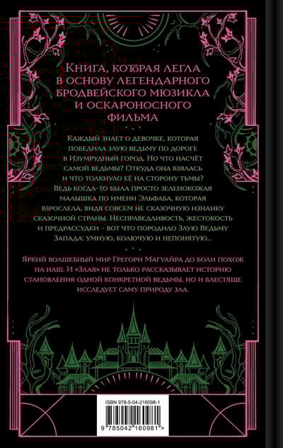 Каждый знает о девочке, которая победила злую ведьму по дороге в Изумрудный город. Но что насчёт самой ведьмы? Откуда она взялась и что толкнуло её на сторону тьмы? Ведь когда-то была просто зеленокожая малышка по имени Эльфаба, которая взрослела, видя совсем не сказочную изнанку сказочной страны. Несправедливость, жестокость и предрассудки - вот что породило Злую Ведьму Запада: умную, колючую и непонятую...