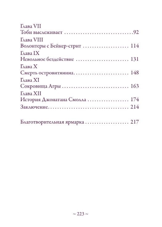 В книге представлена детективная повесть британского писателя Артура Конан Дойла (1859–1930) «Знак четырёх». В ней давно полюбившийся читателям сыщик Шерлок Холмс раскрывает тайны обладателей сокровищ Агры, а его верный друг доктор Джон Ватсон впервые встречает свою будущую жену. В издание также вошёл рассказ «Благотворительная ярмарка», написанный Дойлом для сбора средств на нужды Эдинбургского университета.