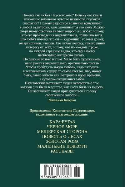 Константин Паустовский — крупнейший русский писатель, автор замечательной лирико-автобиографической прозы, исполненной любви к русской природе и русской культуре. Паустовский неоднократно номинировался на Нобелевскую премию, его произведения переведены на многие языки и по праву считаются классикой отечественной литературы ХХ века. Для советских читателей Паустовский — это олицетворение человеческого и писательского благородства, совесть эпохи. В его творчестве свободно соединились история и современность, верность правде жизни и романтическая приподнятость над нею, интимно-личное и общезначимое. В настоящий том включены наиболее известные произведения Константина Паустовского, в том числе повесть «Кара-Бугаз», с которой началась литературная слава писателя; «Мещерская сторона» и «Повесть о лесах», воспевающие красоту среднерусской земли; «Золотая роза», посвященная сущности писательского труда и природе искусства слова; тяготеющая к притче философская фантазия «Созвездие Гончих Псов» и другие произведения.