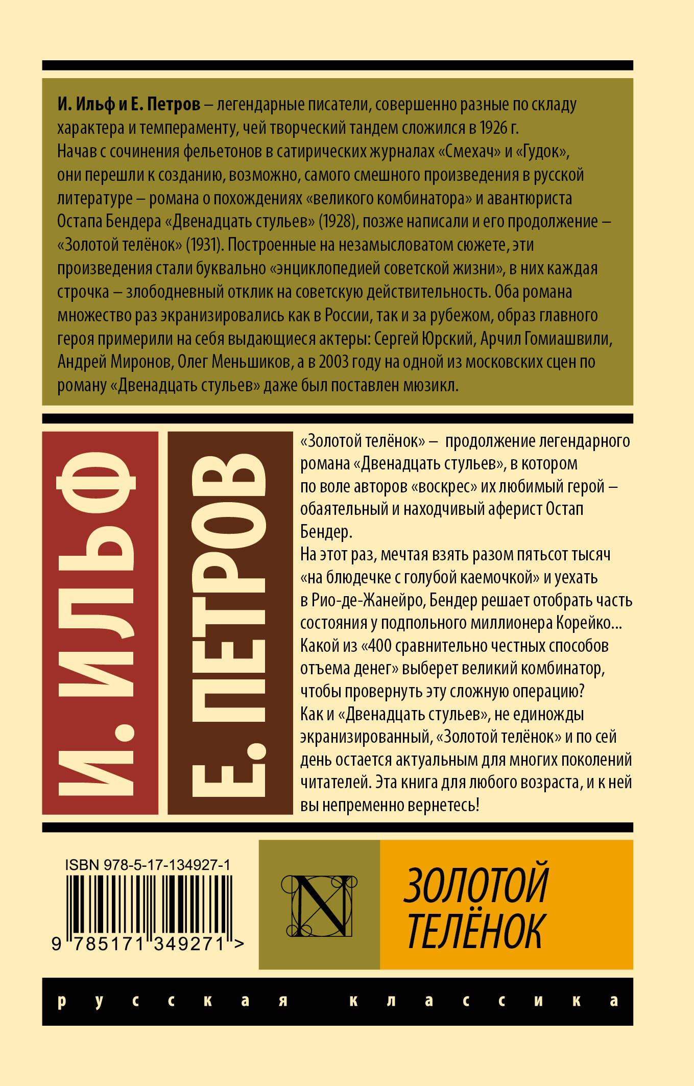 Какой из «400 сравнительно честных способов отъема денег» выберет великий комбинатор, чтобы провернуть эту сложную операцию? Как и «Двенадцать стульев», не единожды экранизированный, «Золотой телёнок» и по сей день остается актуальным для многих поколений читателей. Это книга для любого возраста, и к ней вы непременно вернетесь!