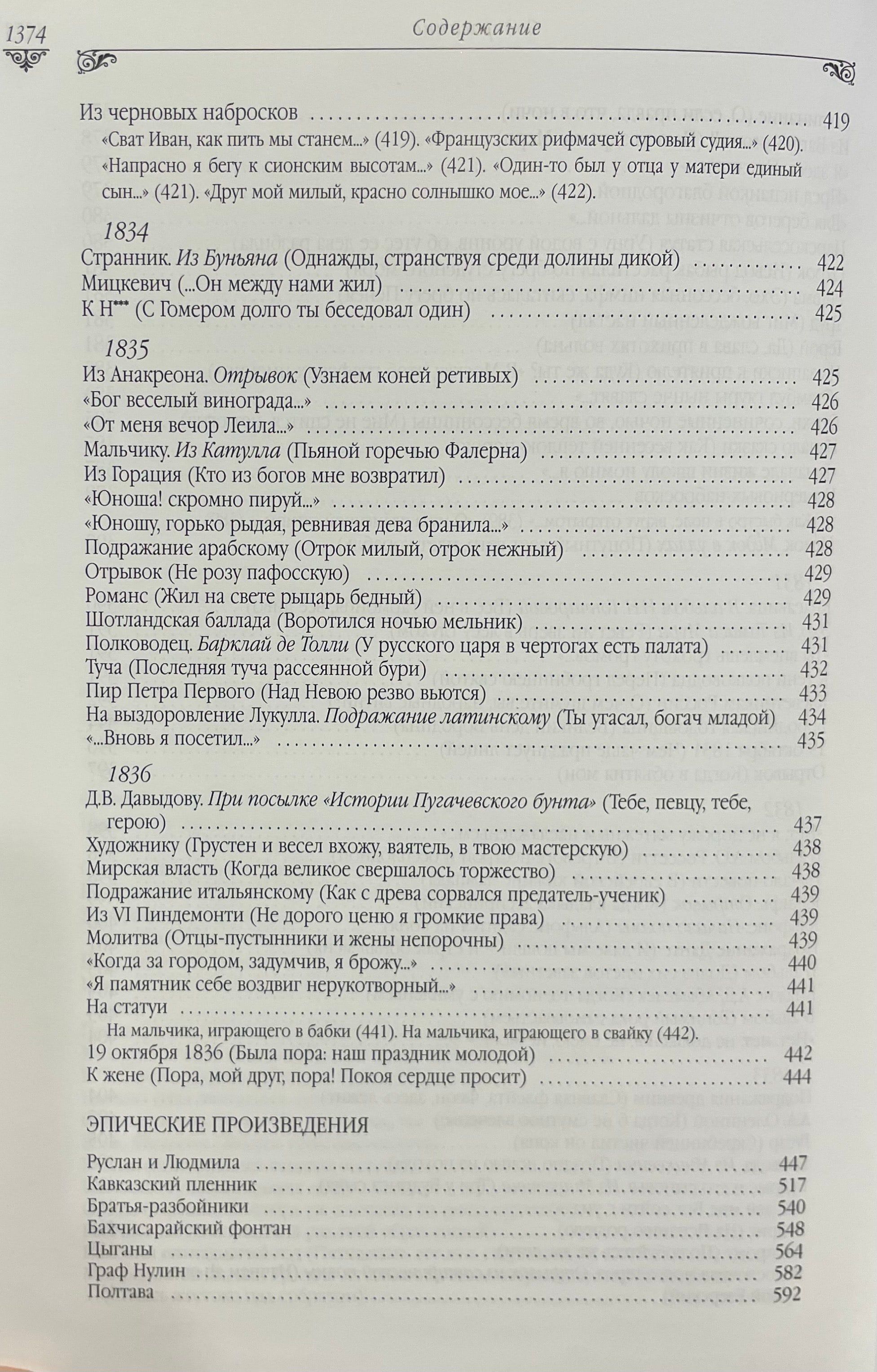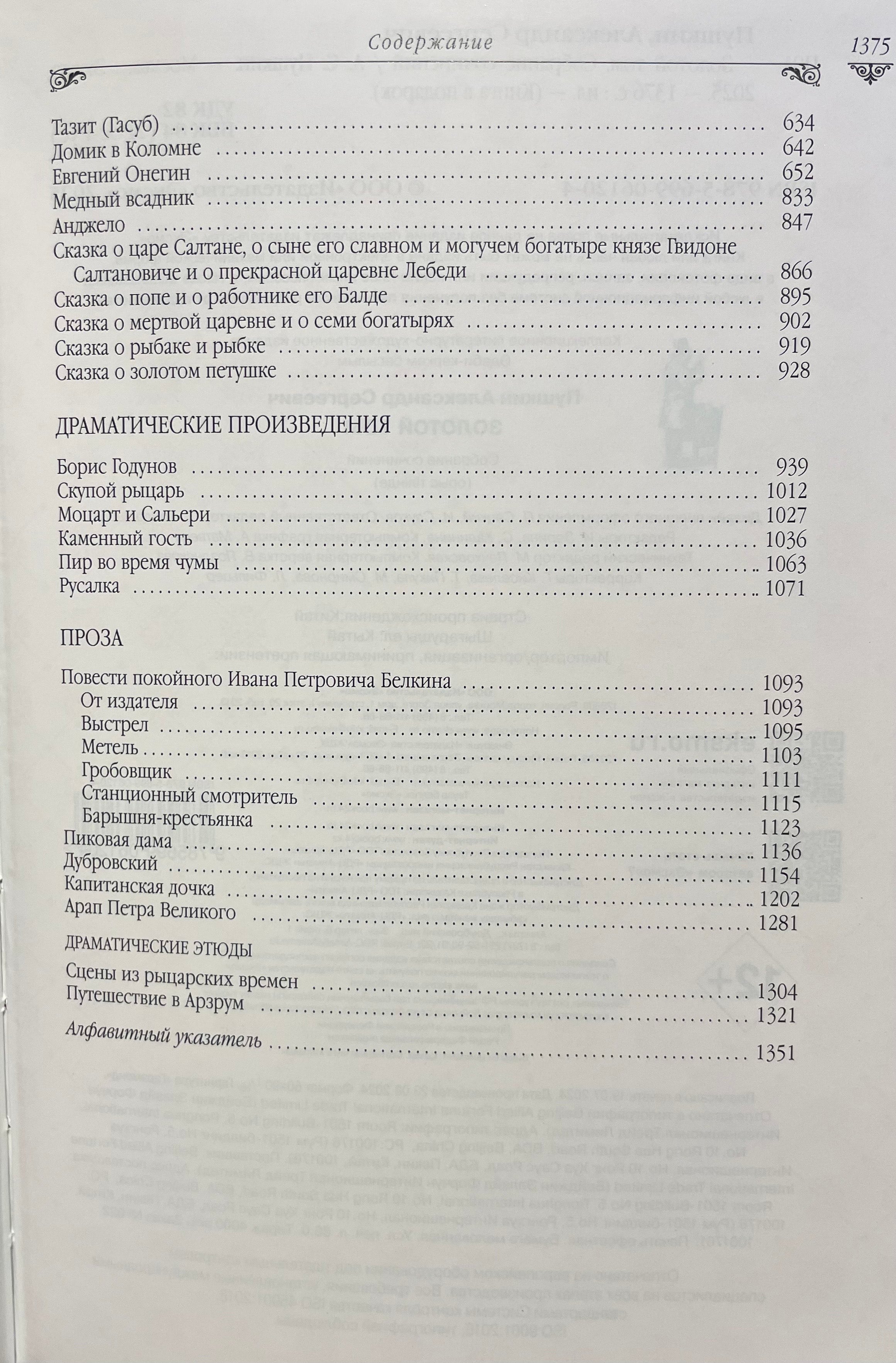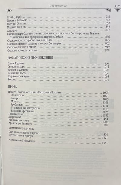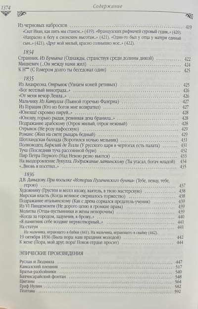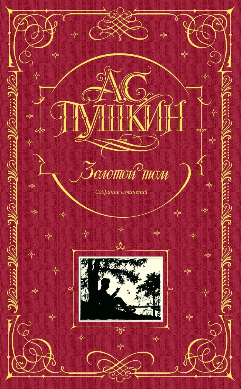 Роскошное, стильно оформленное подарочное издание. Изящный тканевый переплет книги выполнен с рельефным тиснением под «золото» и трехсторонним золотым обрезом. Издание снабжено шелковым ляссе. В настоящее издание сочинений Пушкина включены все произведения великого поэта, все законченное и цельное, до мелких стихотворений и отрывков включительно. В расположении материала «золотого» тома редакция издательства руководствовалась тем, что принято в большинстве изданий Пушкина: проза , поэзия, а далее в каждом из этих больших разделов были выделены произведения значительного объема: романы, повести, драмы, а все остальные более мелкие произведения расположены в хронологическом порядке по годам.