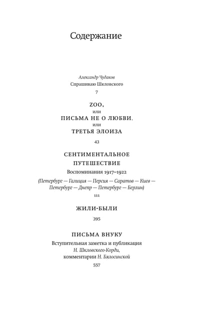 В настоящее издание вошли три произведения Виктора Шкловского, а также уникальный личный документ «Письма внуку». Сборник открывает мемуарный роман, написанный в двадцатые годы и посвященный Эльзе Триоле («Zoo, или Письма не о любви»). «Сентиментальное путешествие» — автобиографическая проза, родившаяся в эмиграции и опубликованная в 1923 году в Берлине. Между героем и автором разница в несколько лет, однако первый — совсем еще молодой и в чем‑то наивный человек, готовый рисковать собой ради родины и революции; второй же — успел разочароваться в прошлых идеалах. «Жили‑были» — книга, над которой автор работал всю свою долгую литературную жизнь. В ней он рассказывает о Максиме Горьком, Всеволоде Иванове, Сергее Эйзенштейне и других современниках.