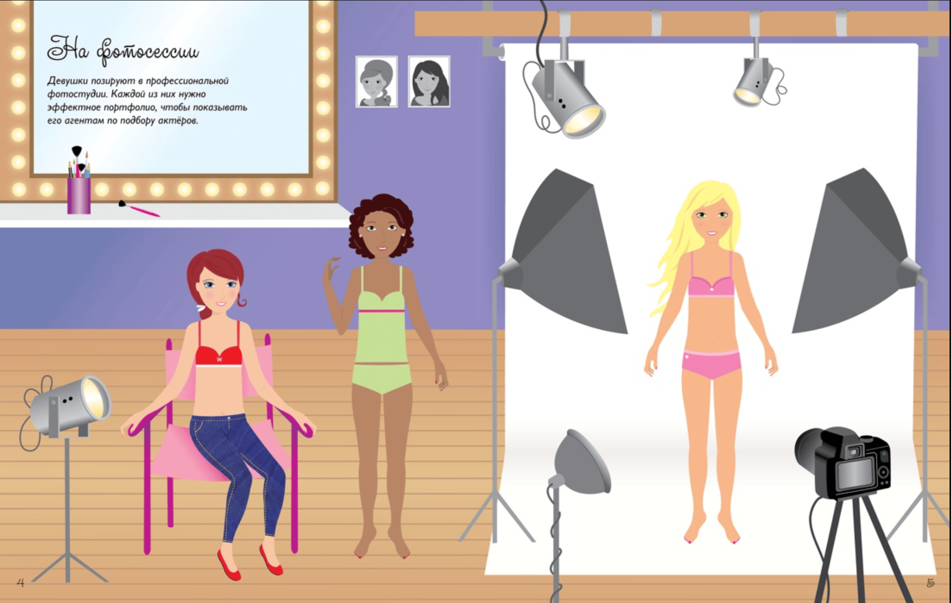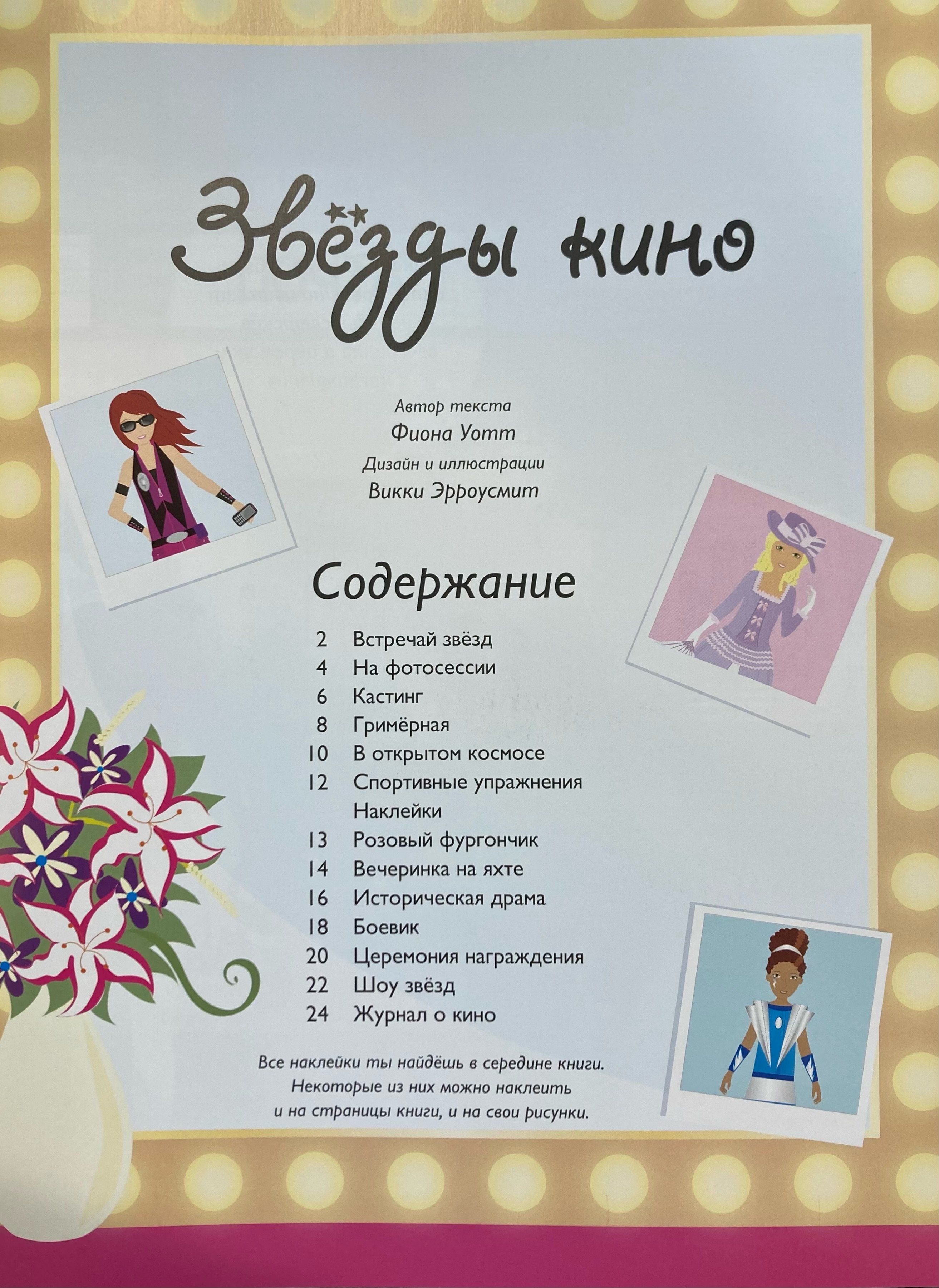 Ты мечтаешь познакомиться cо звёздами кино и узнать, как они живут? В этой книжке ты заглянешь в гримёрную, побываешь на съёмках фантастического фильма, исторической драмы и боевика. С помощью ярких наклеек одень актрис для съёмок и церемонии награждения.