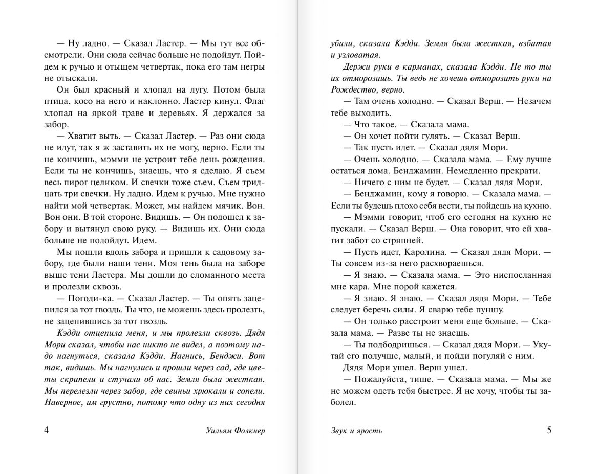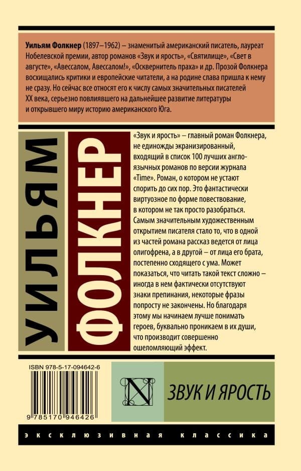 «Звук и ярость» – главный роман Фолкнера, не единожды экранизированный, входящий в список 100 лучших англоязычных романов по версии журнала «Time». Роман, о котором не устают спорить до сих пор. Это фантастически виртуозное по форме повествование, в котором не так просто разобраться. Самым значительным художественным открытием писателя стало то, что в одной из частей романа рассказ ведется от лица олигофрена, а в другой – от лица его брата, постепенно сходящего с ума. Может показаться, что читать такой текст сложно – иногда в нем фактически отсутствуют знаки препинания, некоторые попросту фразы не закончены. Но благодаря этому мы начинаем лучше понимать героев, буквально проникаем в их души, что производит совершенно ошеломляющий эффект.